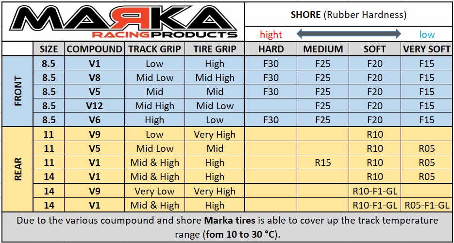 Marka Racing tires have a lower degraded performance than other tires on the market today, ensuring stable performance in each round. The compound of the material garantees the homogenity between different batches produced at different times.